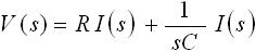 また、抵抗やコンデンサの時間領域の式のラプラス変換は、前節「3-2. ラプラス変換」の「2. 抵抗、容量、インダクタのラプラス変換」で述べた通りです。以上より、式(3) のラプラス変換は下式(4) のように表されます。