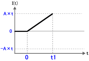 結果、t = 0 から t = t1 までは I(t) = A/t1 × t となり、時間 t に比例して直線となります。